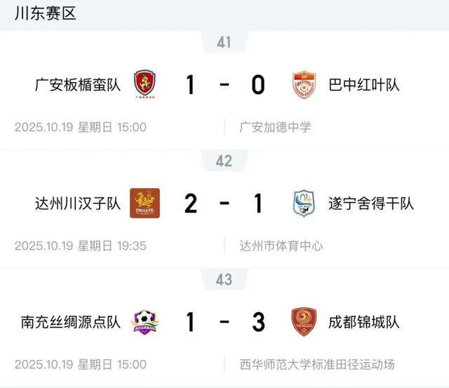 揭晓川超联赛比赛报道!第五轮激战已经结束,各赛区积分榜争夺已更新!本文提供了最新的赛果和积分榜,帮助您了解最新的川超联赛新闻,一起观看! *截至10月19日,川东赛区均由该赛区组织。图片来源:足球中国App(下均) 广安半城野蛮人巴中红叶队 10月19日,2025/2026四川银行四川省城市足球联赛川东赛区第五轮,广安半城野蛮人主场迎战巴中红叶队。全场比赛结束,广安队主场1:0战胜巴中队,取得“川超联赛”开赛以来的首场胜利。 10月19日下午,南充丝绸队与成都金城队打响2025/2026川行第五轮比赛“巅峰之战”四川省城市足球联赛川东赛区。南充丝源队主场迎战成都金城队。终场哨声响起,成都队客场3:1战胜南充队。 10月19日晚,2025/2026四川银行四川省城市足球联赛四川东赛区第五轮比赛,达州四川汉子队与遂宁舍德队主场迎战苏宁舍德队。最终,达州队主场2:1击败苏军队。川东赛区积分榜来源:四川观察(下同) 川西赛区眉山射箭队与攀枝花攀枝花钢勇士2025/2026四川银行四川省城市足球联赛川西赛区第五轮,眉山射箭队vs攀枝花 攀枝花钢钢队vs攀枝花 攀枝花勇士队,经过一番激战,比分定格为1:0。10月19日,梁山良医队对阵雅安千奇队,第五轮比赛2025/2026四川银行四川省城市足球联赛中,凉山好医生队主场迎战雅安千骑队。最终比分定为5:0。 川西赛区积分榜 川北赛区 广元剑门雄关队 德阳重装队 10月18日,2025/2026四川银行四川省城市足球联赛第五轮比赛中,广元重装队剑门雄关队主场迎战德阳重装队。随着比赛终场哨声吹响,广元剑门雄关队主场1:0战胜德阳重装。全场唯一进球出现在第65分钟,广元队回敬前场任意球机会扳平比分。 18号球员段正刚禁区抽射锁定胜局。阿坝州雪山鹰 绵阳九州长虹队 10月18日 2025/2026赛季川行四川第五轮省城市足球联赛(简称“川超联赛”)继续精彩。川北赛区的阿坝州雪山鹰队在主场茂县体育场迎战绵阳九洲长虹队。比赛第83分钟,绵阳队突然中场发起进攻,快速将球传至禁区。没有。最终,绵阳队将这一比分保持到终场,客场全取三分。川北赛区积分榜 川南赛区 资阳中国雅谷队 宜宾长江首城队 10月18日下午,资阳中国雅谷队在主场迎战宜宾长江首城队。上半场刚开始一分钟,宜宾队就利用点球机会赢得了梦幻开局。最终,宜宾队客场5:0战胜资阳队,带走3分。泸州椒香队内江崇龙酒业有限公司10月18日凌晨1点35分,2025/2026“川超联赛”泸州赛区的比赛,泸州椒乡队对阵内江崇龙酒业队的比赛在泸州奥体公园正式打响,补时第99分钟,泸州队左路传中。没有。 41号魏洪林禁区内高高跃起,头球破门。泸州队连进两球,再次追平比分。全场比赛结束,两队战成2:2平,各得1分。且看四川南赛区第六轮时的射手榜! Part.01 川东赛区01 达州 vs 广安 ✅ 比赛时间:2025年10月26日 19:35 ✅ 比赛地点:达州体育中心 ✅ 团体比赛:达州四川汉子队 vs 广安板城男子队 ✅ 门票价格:5元,门票普切普切普切普切普切普切普切普切普切普切普切:四川观察客户端 * 截至发稿,仍有余票。 Part.02 川西赛区 Part.03 川南赛区赛区04川北赛区01 德阳vs甘孜 ✅比赛时间:2025年10月25日15:00(热身赛14:30开始) ✅地点比赛:德阳体育公园体育场 ✅团体比赛:德阳重型装备队 vs 甘孜州有机牦牛队 ✅票价:9元 ✅门票开放时间:第一期:10月19日10:00 第二期阶段: 10月21日10:00 ✅购票入口:四川观察、大麦App 更多新闻持续更新(成都当地掌柜)