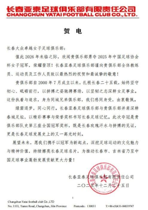 12月24日晚,2025年中国女足协会杯决赛中,长春大众优秀女足以2-0击败广东女足,首次捧起冠军奖杯。长春亚泰足球俱乐部发来贺电,祝贺表现出色的长春大众女足夺得2025年中国足协杯(女足)冠军。长春亚泰足球俱乐部有限公司向长春大众优秀女子足球俱乐部发来贺电:值此2026年之际,很高兴得知贵队荣获2025年中国足协杯女足冠军并登顶榜首!长春亚泰足球俱乐部向贵俱乐部全体教练员、运动员和工作人员致以最热烈的问候和诚挚的敬意!自2000年7月成立以来,贵俱乐部在长春已有25年历史。它一直跟随它不忘初心、砥砺前行,用奋斗奔跑在赛场上,用毅力深耕女足事业。这种坚持和追求,作为同城兄弟俱乐部,我们深表同情,也由衷敬佩。逐梦园中,同心同行。长春亚泰足球俱乐部与贵俱乐部深度参与春城足球事业,用精彩的赛事和奖杯颁奖书写长春足球的美好回忆。本次冠军是贵俱乐部历史上第三座全国冠军奖杯。这不仅是长春罗斯汗水和努力的见证,也是长春足球发展史上的又一高光时刻。展望未来,希望我们共同努力,以办冠军为新起点,深入挖掘足球运动的文化美和精神价值,持续擦亮长春足球名片,为长春足球的蓬勃发展进一步贡献力量。长春市、吉林省乃至中国足球事业的发展!长春亚泰足球俱乐部有限公司 2025年12月25日