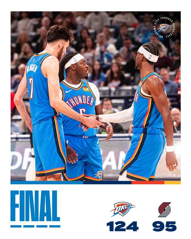 网易体育1月1日报道:NBA常规赛继续进行,波特兰开拓者队(14胜20负)结束连胜。亚历山大拿下30分。他带领7名球员得分上双。俄克拉荷马城雷霆队(29胜5负)前三节逐渐建立起较大优势。他们在主场以124-95击败开拓者队。雷霆队取得3连胜,开拓者队结束了2连胜。替补出场的杨汉森拿下3分5篮板。雷霆队的亚历山大30分6助攻,米切尔17分5篮板,乔15分,威廉姆斯13分7篮板7助攻,霍姆格伦12分10篮板,多特12分,卡森12分7篮板。开拓者队西索科得到19分,阿夫迪亚得到17分7篮板7助攻,夏普得到14分4篮板,乐福得到10分5篮板4助攻,穆雷得分编10分。杨汉森替补出场10分50秒,4投1中,三分球2中1,拿下3分5篮板。雷霆队在主场取得了良好的开局。亚历山大、多特、霍姆格伦轮流得分,他们以10-4领先。卡马拉命中三分缩小差距。亚历山大和多尔特三分命中。首节还剩5分35秒时雷霆队以18-12领先。克林根和阿夫迪亚各得三分,将比分追成18平。卡森替补上场拿下5分。卡鲁索也命中三分,雷霆再次取得领先。两队多次进攻后,卡森单打得手,首节结束雷霆队以38-30领先。第二节开始后,两队你来我往,轮番拉开比分。霍姆格伦和乔联手拿下6分。本节开始三分钟,雷霆队以51-36领先。 Avdija 暂时止血两次罚球。米切尔连续四次犯规,四罚全中。阿夫迪亚不败反扑连得5分。开拓者队奋力守住比分。半场结束前亚历山大突然爆发,独得9分,带领球队打出13-2的进攻高潮结束第二节。雷霆73-55领先。雷霆队的亚历山大上半场得到18分和5次助攻,霍姆格伦得到12分和7个篮板,米切尔得到10分;开拓者队的阿夫迪亚得到15分。华莱士三分开场,夏普两罚回敬,多尔特连续两记三分,雷霆82-57领先。卡马拉三分回应,亚历山大连续两次突破,雷霆继续扩大领先优势。阿夫迪亚带队试图缩小差距,亚历山大当时带队反击,雷霆牢牢控制优势,乐福投进一记三分。第三节还剩4分30秒时,开拓者队以68-90落后。亚历山大两罚回应。本节还剩3分13秒时,杨汉森替补上场。他很快就抢到了防守篮板。本节还剩1分35秒时,杨汉森左翼三分命中。开拓者队以73-96落败。随后,杨汉森三分不中,米切尔和穆雷分别投中三分。三节结束,开拓者队76-99落后。最后一节开始后杨汉森没有上场,夏普跑投领先得分,乔三分回应,完成7-0攻势。雷霆106-78领先。西索科三分缩小分差,夏普也两罚全中,开拓者队落后23分。第四节还剩7分37秒时,杨汉森再次坐在替补席上。米切尔很快就击中了杨汉森三分命中。双方三分球打成平手。杨汉森勾手再次偏出。最后一节,双方均采用换人的方式结束比赛。最终,雷霆队以124-95的比分获胜。开拓者首发:夏普、西索科、卡马拉、阿夫迪亚、克林根 雷霆首发:亚历山大、华莱士、多尔特、威廉姆斯、霍姆格伦